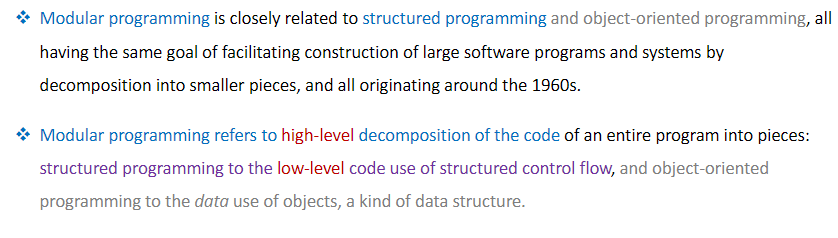 소프트웨어 디자인 테크닉이란, 프로그램을 독립적이고 상호 교환 가능한 모듈로 분리하는 것을 강조하는 것이다. 각 모듈에는 원하는 기능의 한 측면만 실행하는 데 필요한 모든 것이 포함된다.