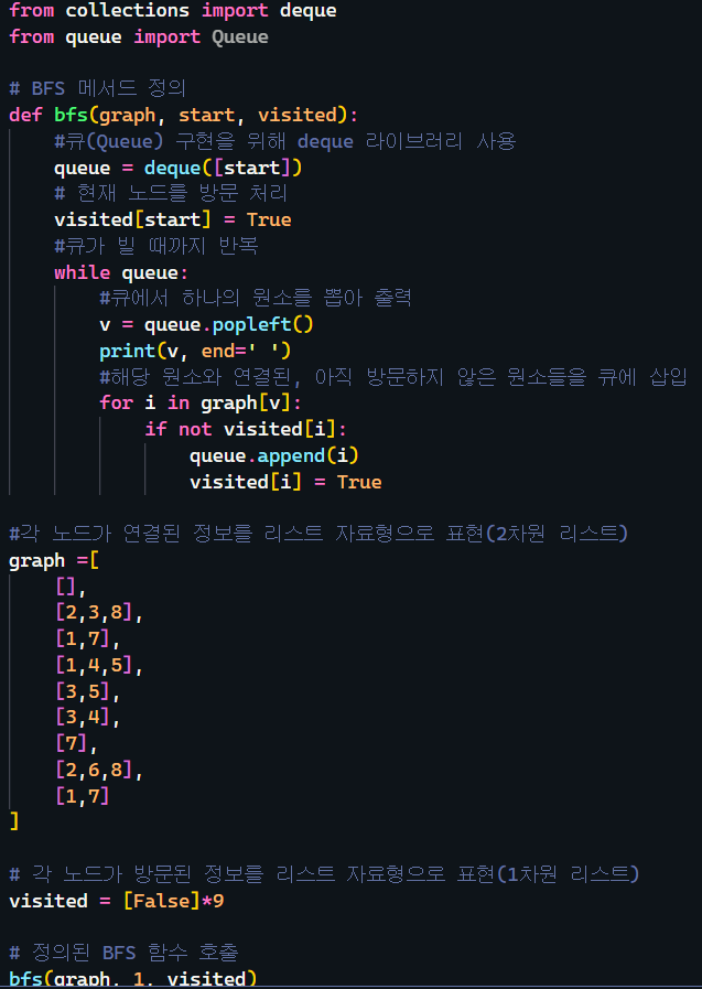 - 큐에서 노드를 꺼내 해당 노드의 인접 노드 중에서 방문하지 않은 노드를 모두 큐에 삽입하고 방문처리를 한다.