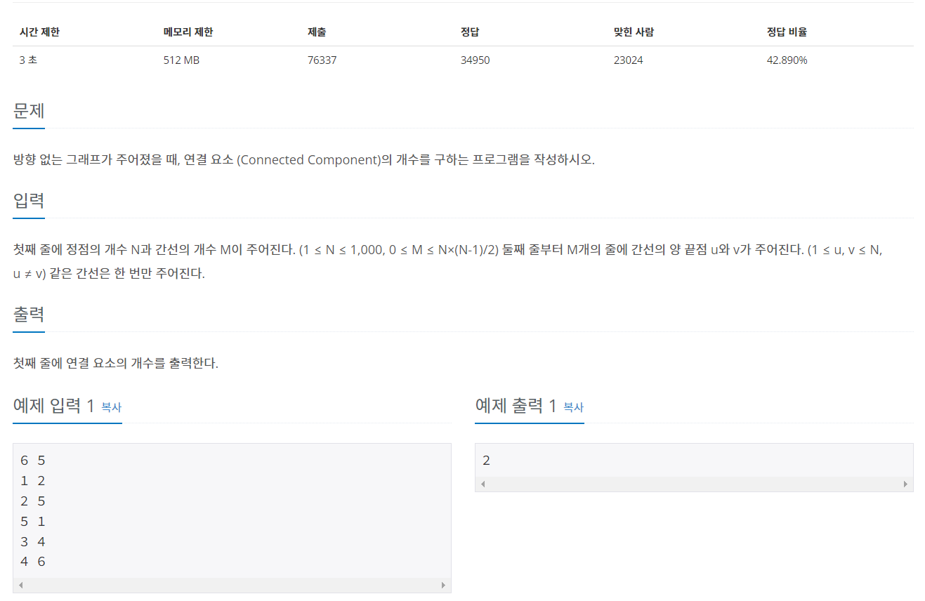 https://www.acmicpc.net/problem/11724 11724번: 연결 요소의 개수첫째 줄에 정점의 개수 N과 간선의 개수 M이 주어진다. (1 ≤ N ≤ 1,000, 0 ≤ M ≤ N×(N-1)/2) 둘째 줄부터 M개의 줄에 간선의 양 끝점 u와 v가 주어진다. (1 ≤ u, v ≤ N, u ≠ v) 같은 간선은 한 번만 주www.acmicpc.net 풀이과정①문제 바라보기간단한 graph이론 문제다. DFS문제고, 이해를 위해서 문제에서 제시한 예제 2개를 간선과 노드로 표현해봤다.위의 그림을 보면 1,2,5가 연결되어있고 3,4,6이 연결되어있음을 확일할 수 있다. 따라서 출력값이 2가 되는 것이며,두번째 그림을 보면 1~6이 모두 어떻게든 연결되어있기에 출력값이 1이 됨을 확인할..