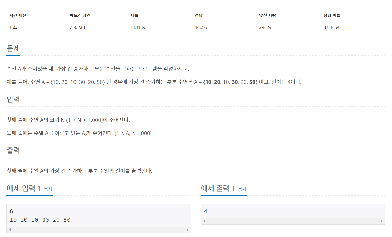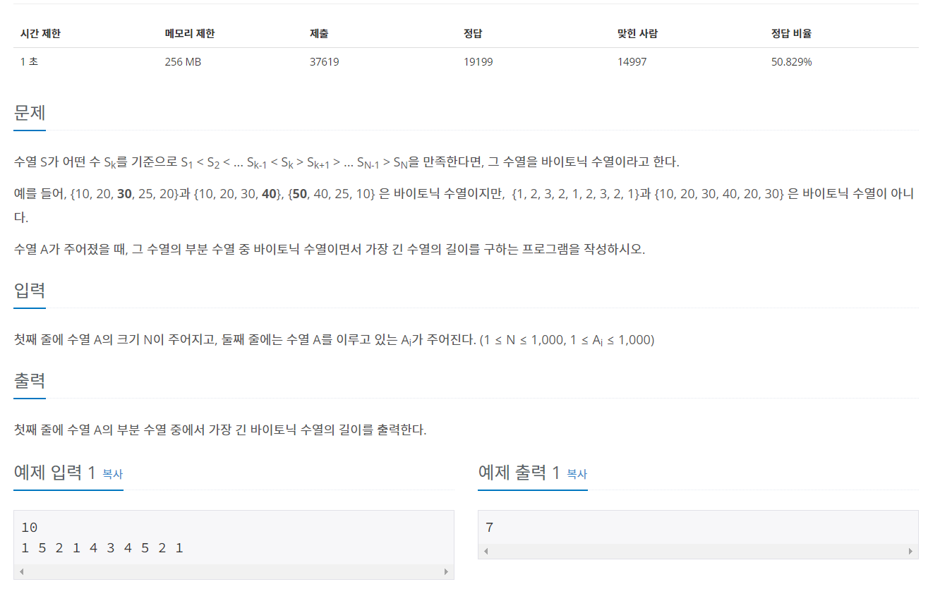 https://www.acmicpc.net/problem/11054 11054번: 가장 긴 바이토닉 부분 수열첫째 줄에 수열 A의 크기 N이 주어지고, 둘째 줄에는 수열 A를 이루고 있는 Ai가 주어진다. (1 ≤ N ≤ 1,000, 1 ≤ Ai ≤ 1,000)www.acmicpc.net풀이과정①문제 들여다보기이 문항은 앞전에 푼 11053문제에서 아주 살짝 업그레이드 된 버전의 문제이다.https://stopmin.tistory.com/46 [백준] 11053번 가장 긴 증가하는 부분수열 (Python)https://www.acmicpc.net/problem/11053 11053번: 가장 긴 증가하는 부분 수열 수열 A가 주어졌을 때, 가장 긴 증가하는 부분 수열을 구하는 프로그램을 작성하시오. 예를 ..